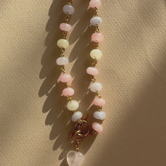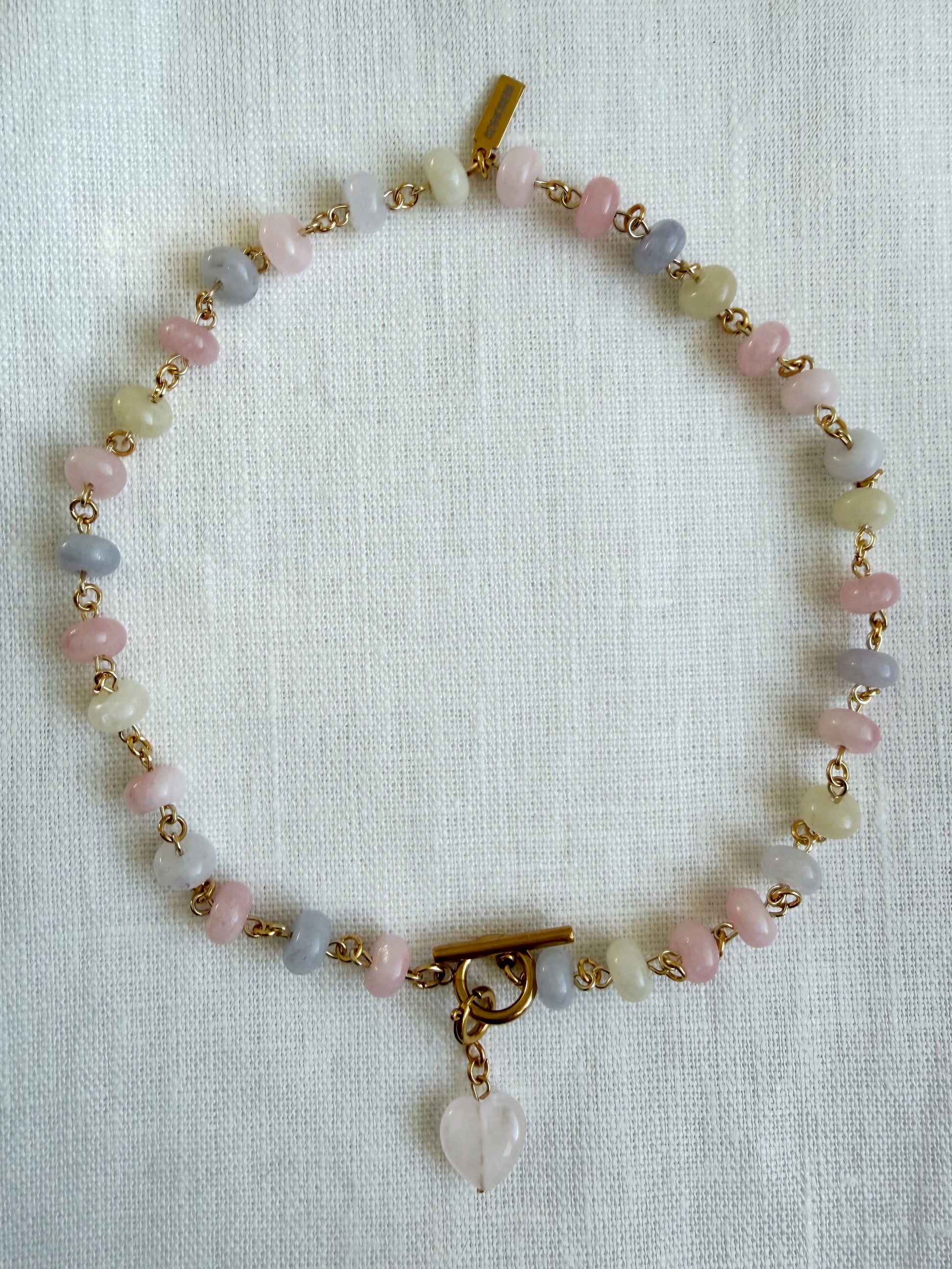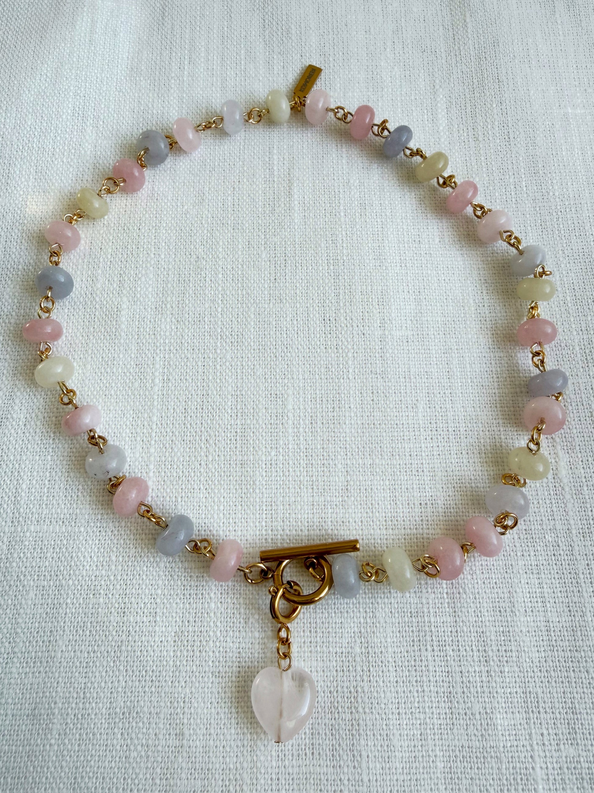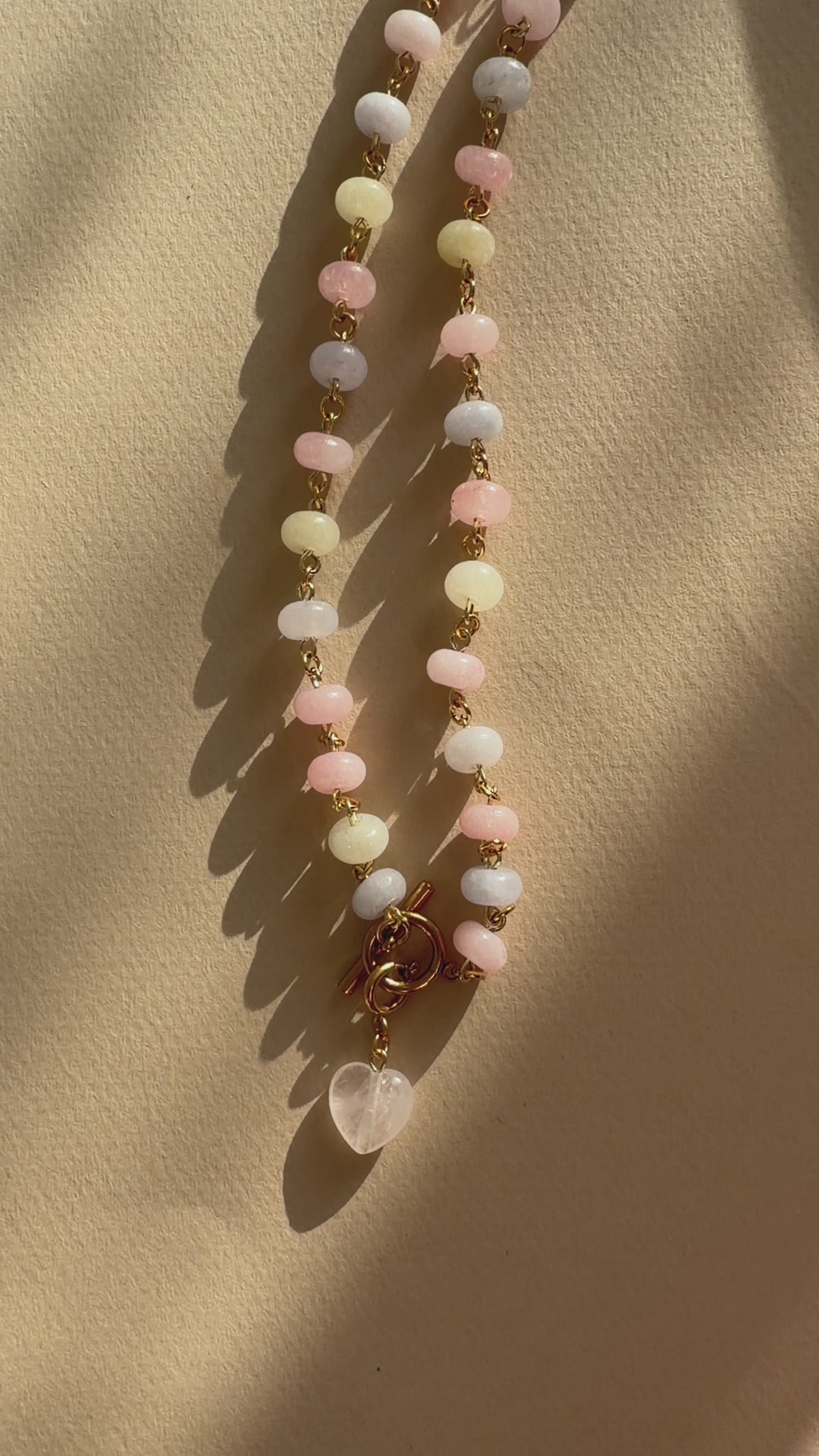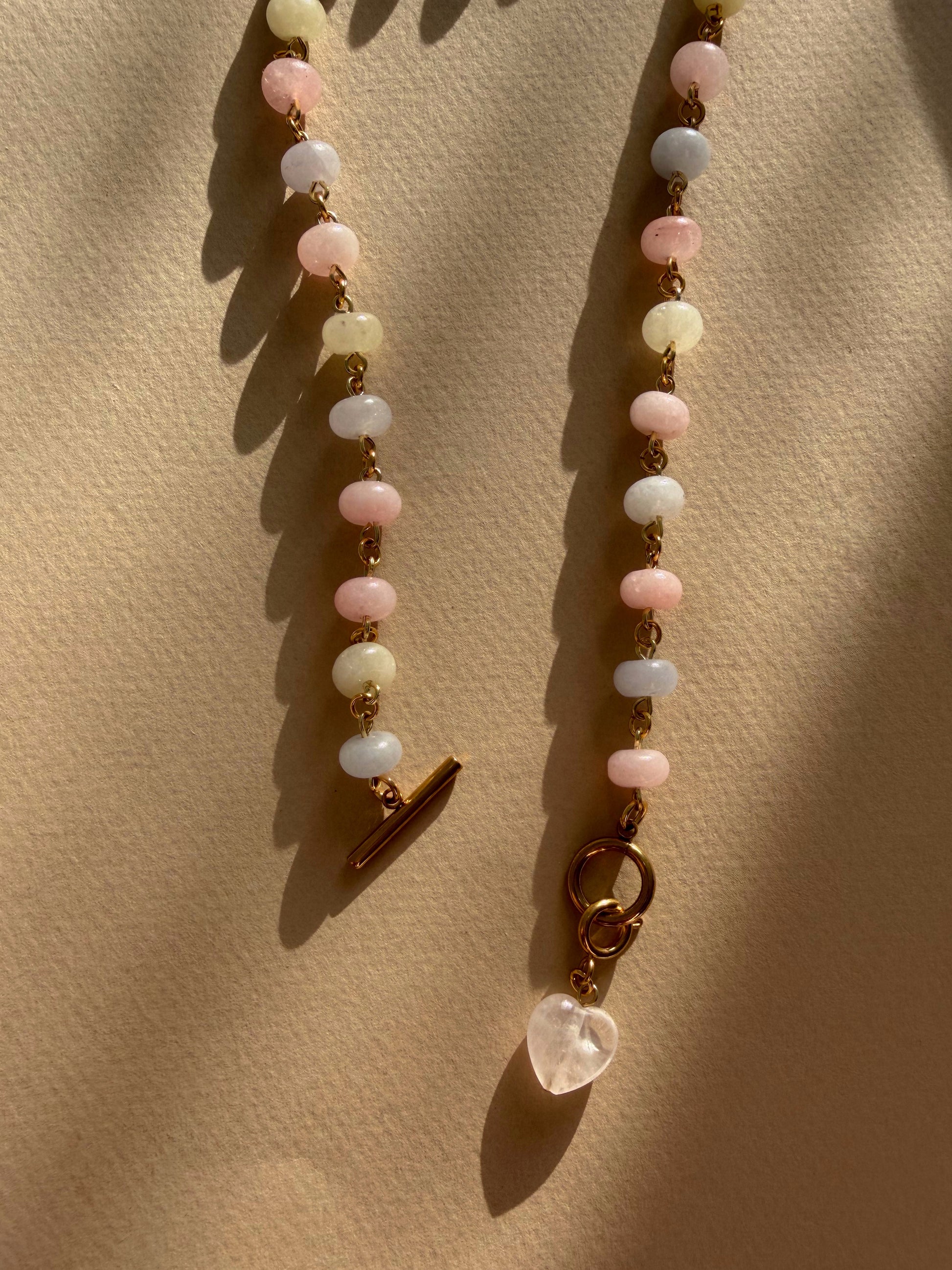 Ein abnehmbarer Herzanhänger aus Rosenquarz rundet das Design ab und bietet somit zwei Stile in einem Schmuckstück: mit Herz für eine zarte Note oder ohne für einen minimalistischeren Look.