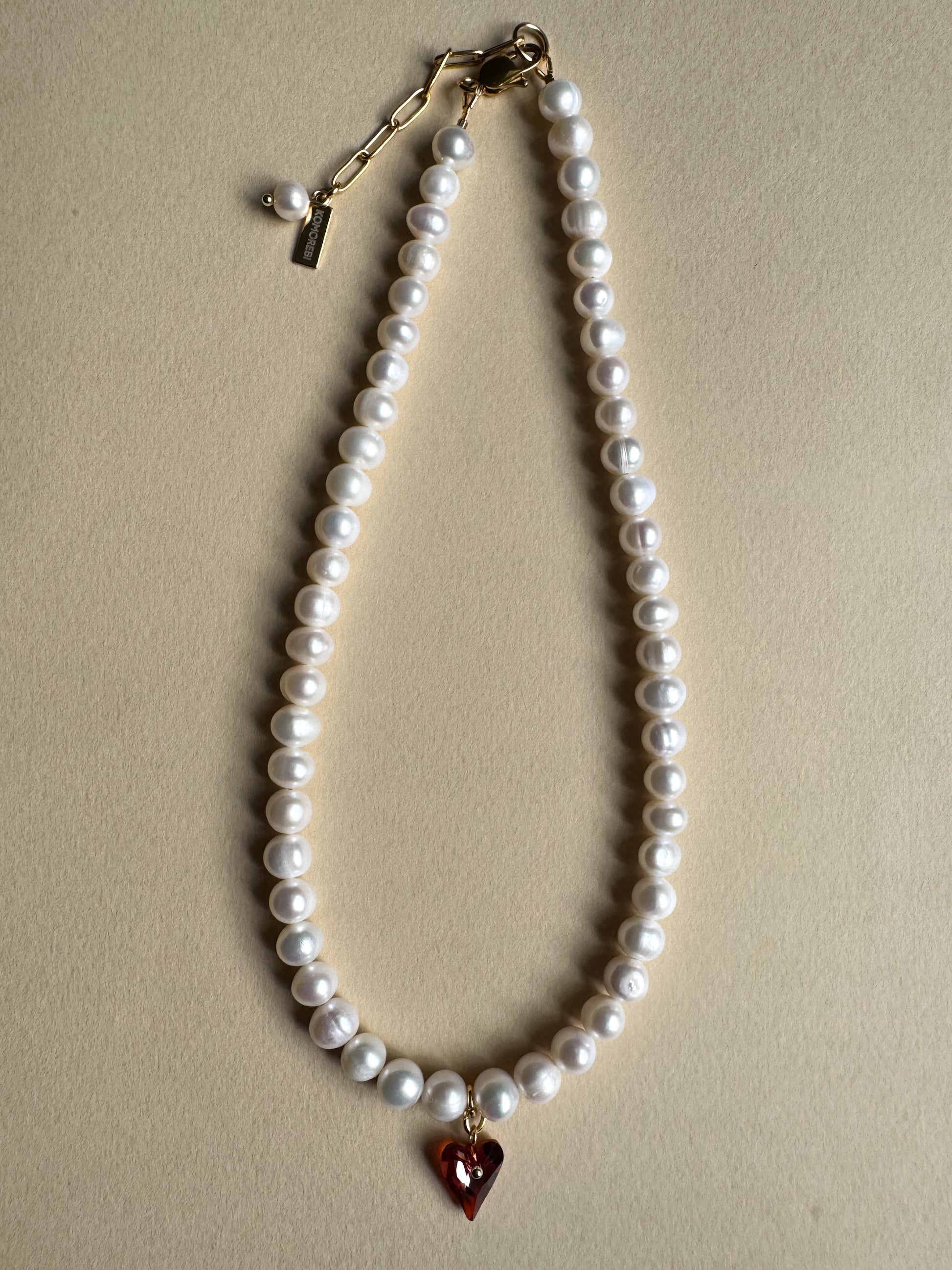 Halskette aus weißen Süßwasserperlen mit einem Herzanhänger aus geschliffenem Kristall. Feine Handarbeit.