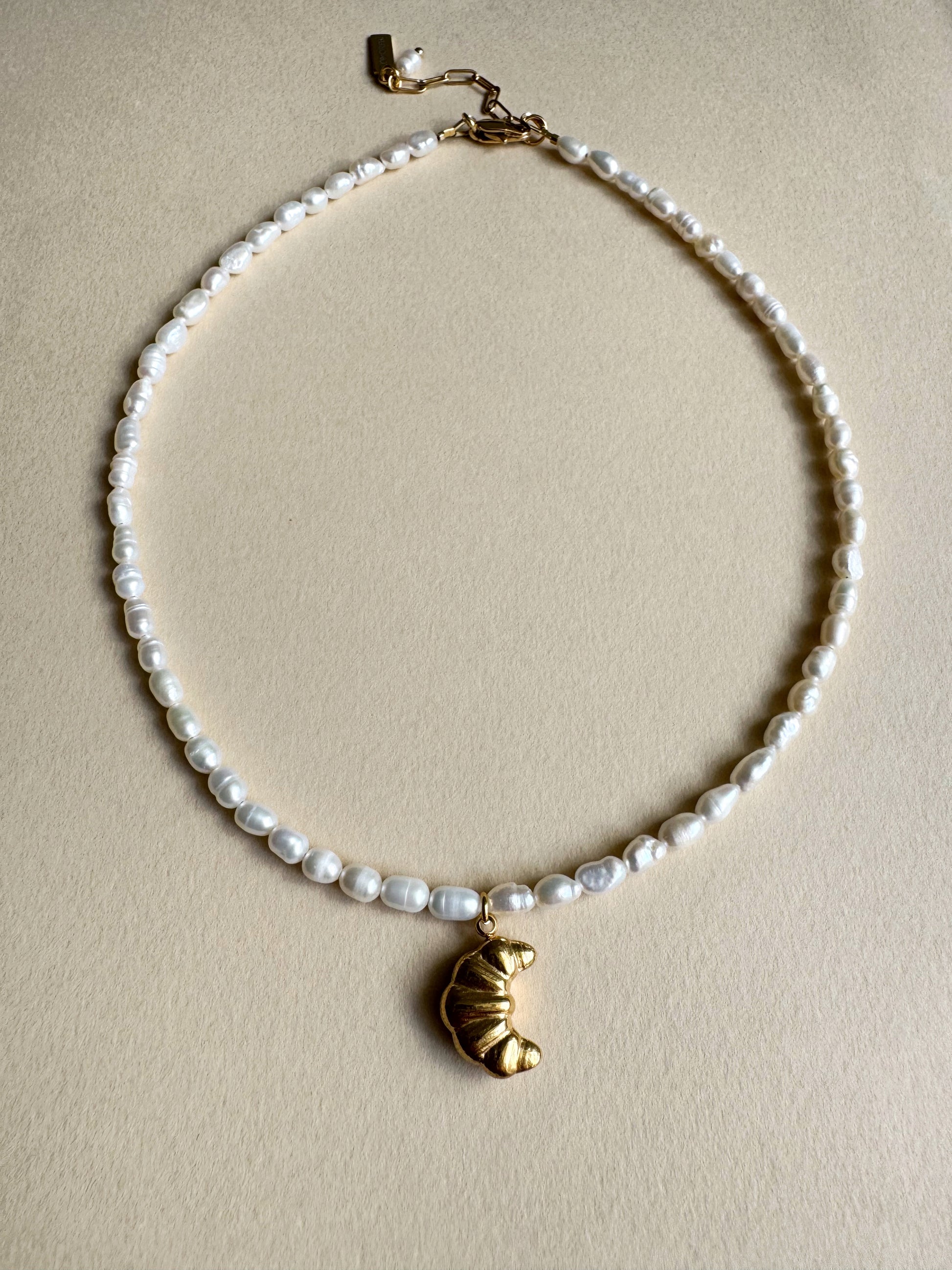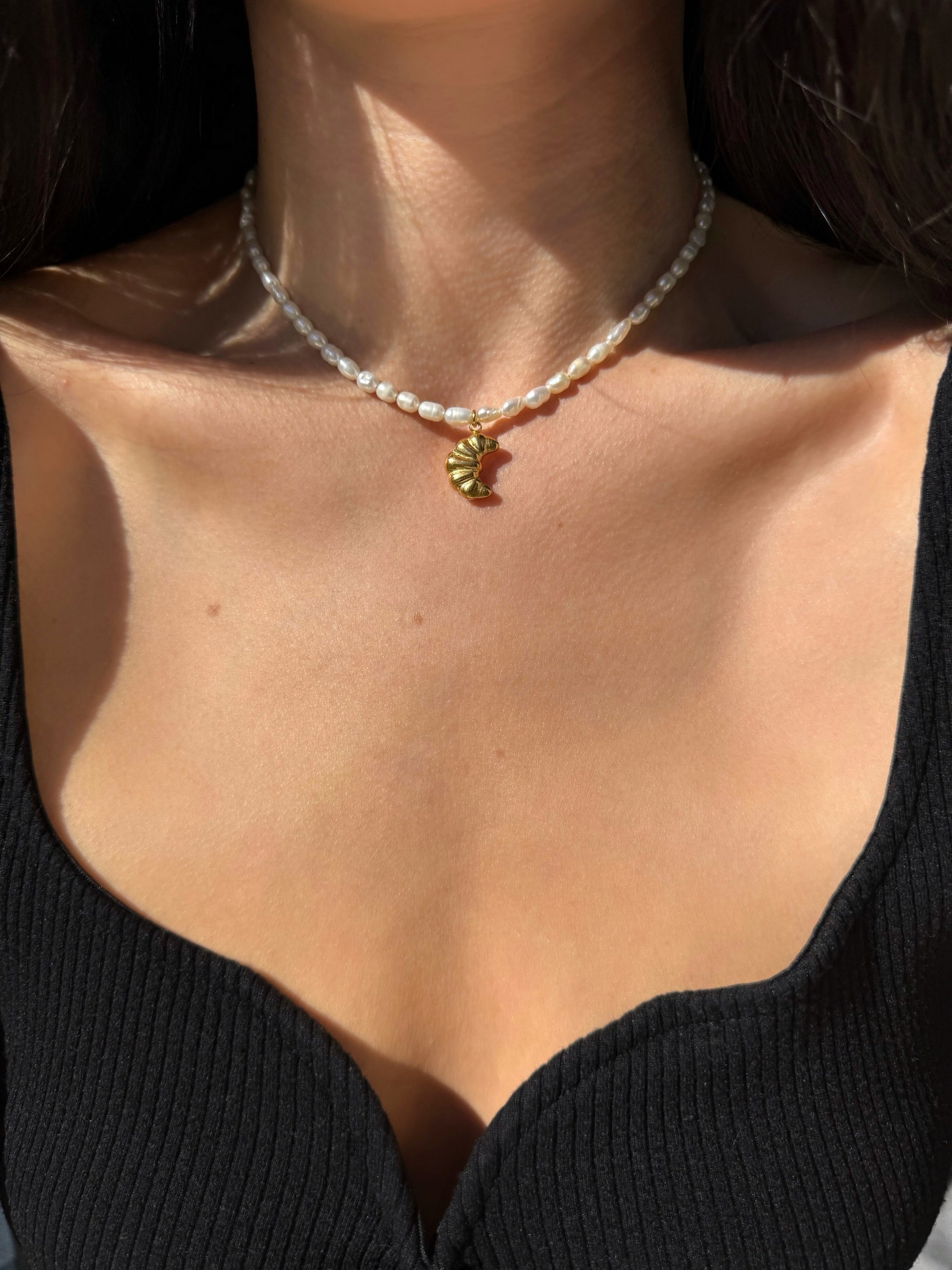 Halskette aus Süßwasserperlen mit vergoldetem Halbmondanhänger. Zart handgefertigt.