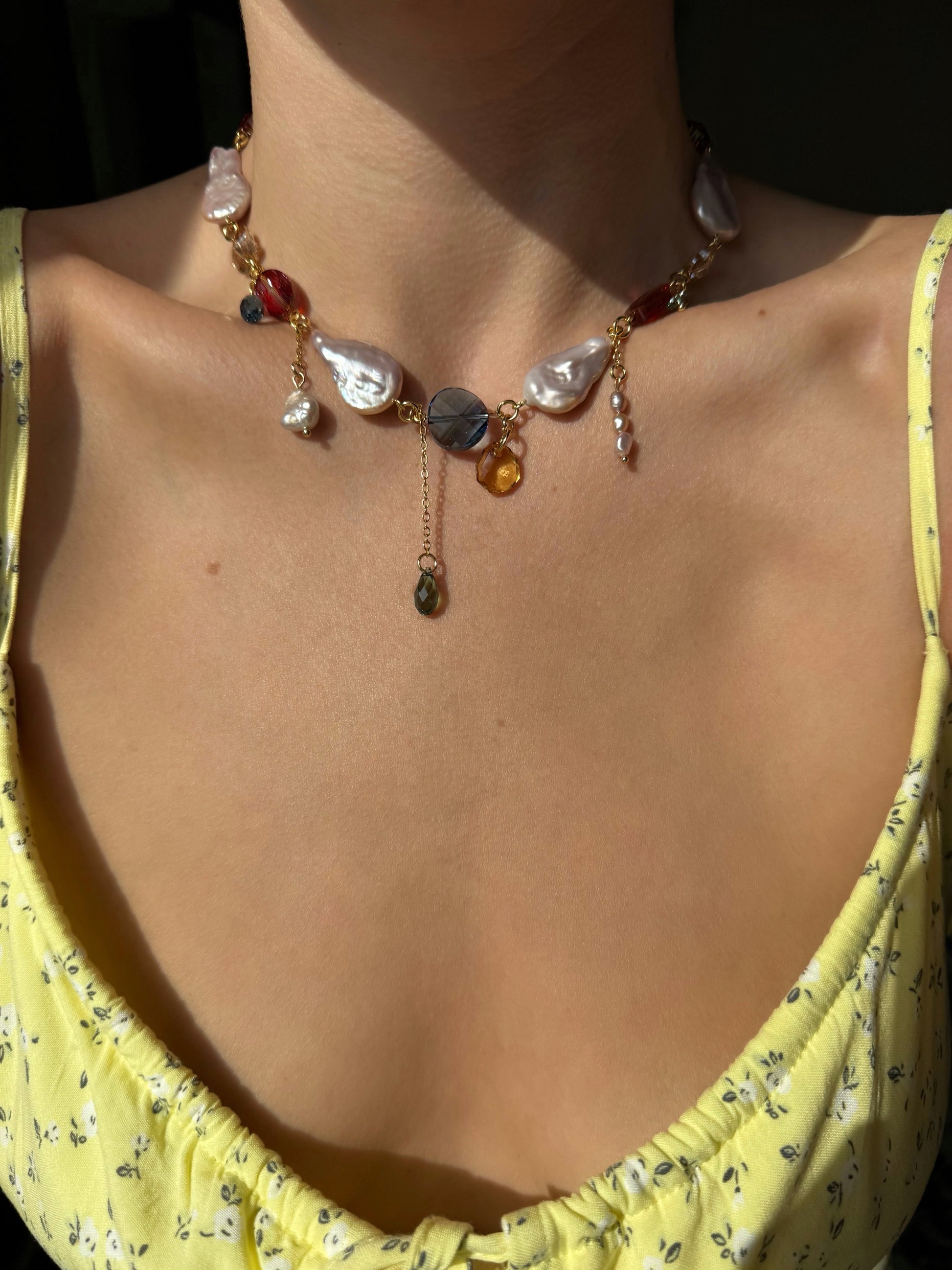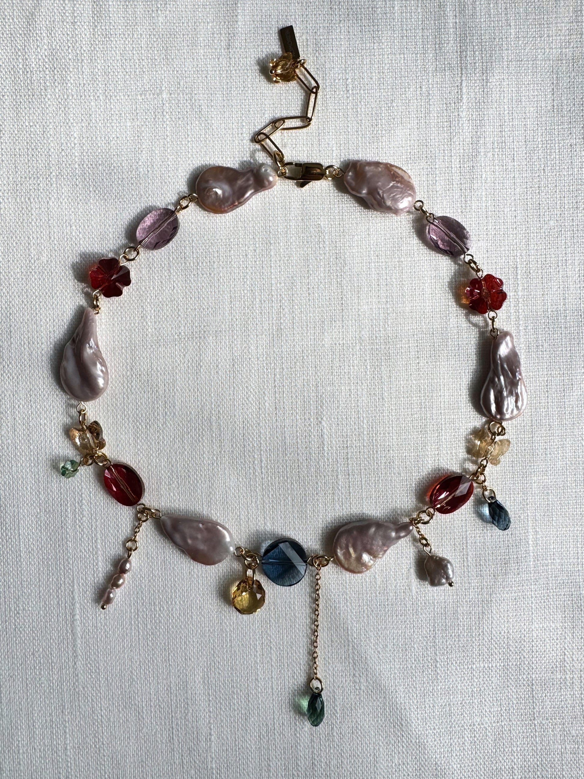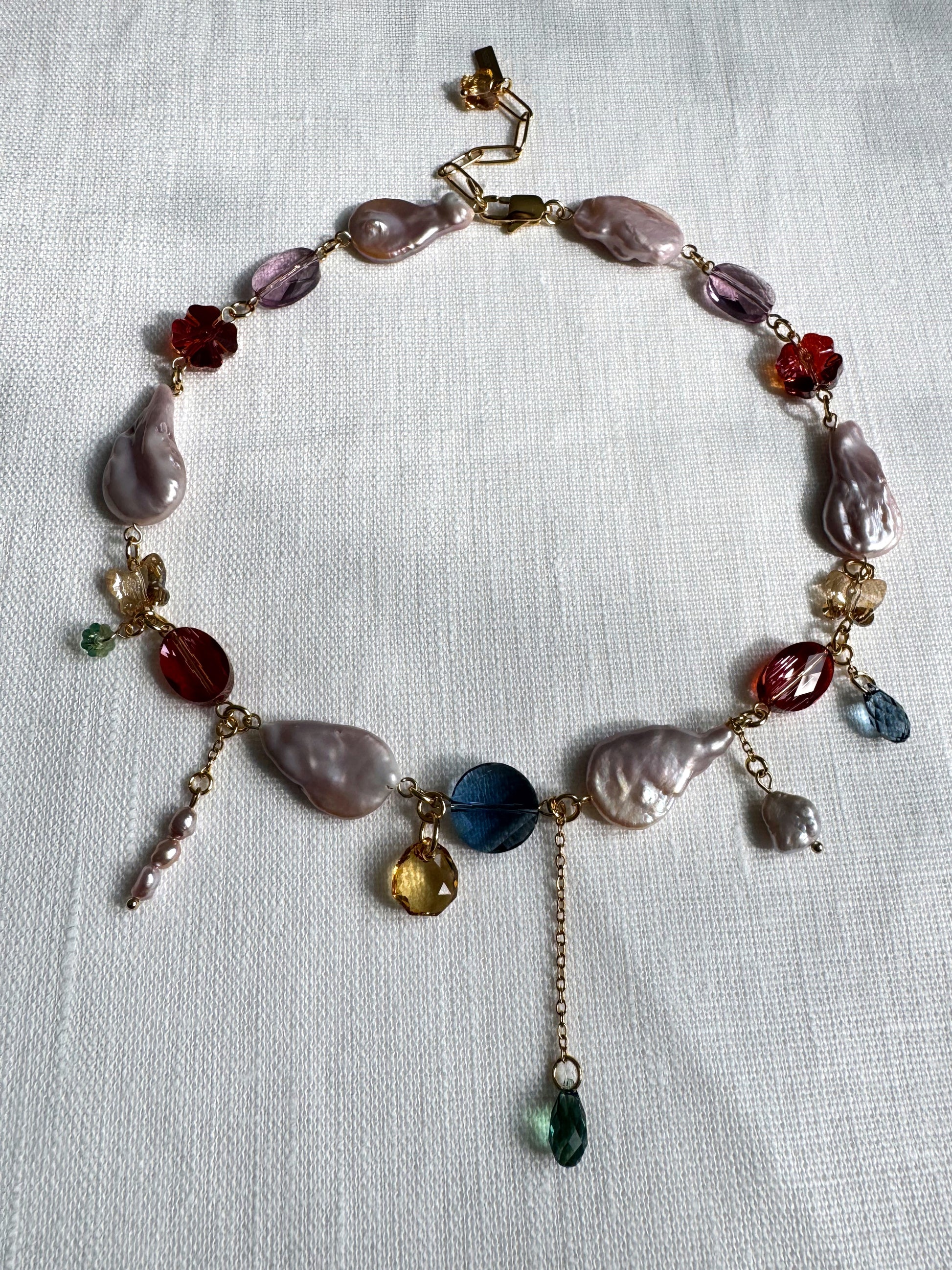 Halskette aus Barockperlen und mehrfarbigen Kristallen