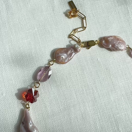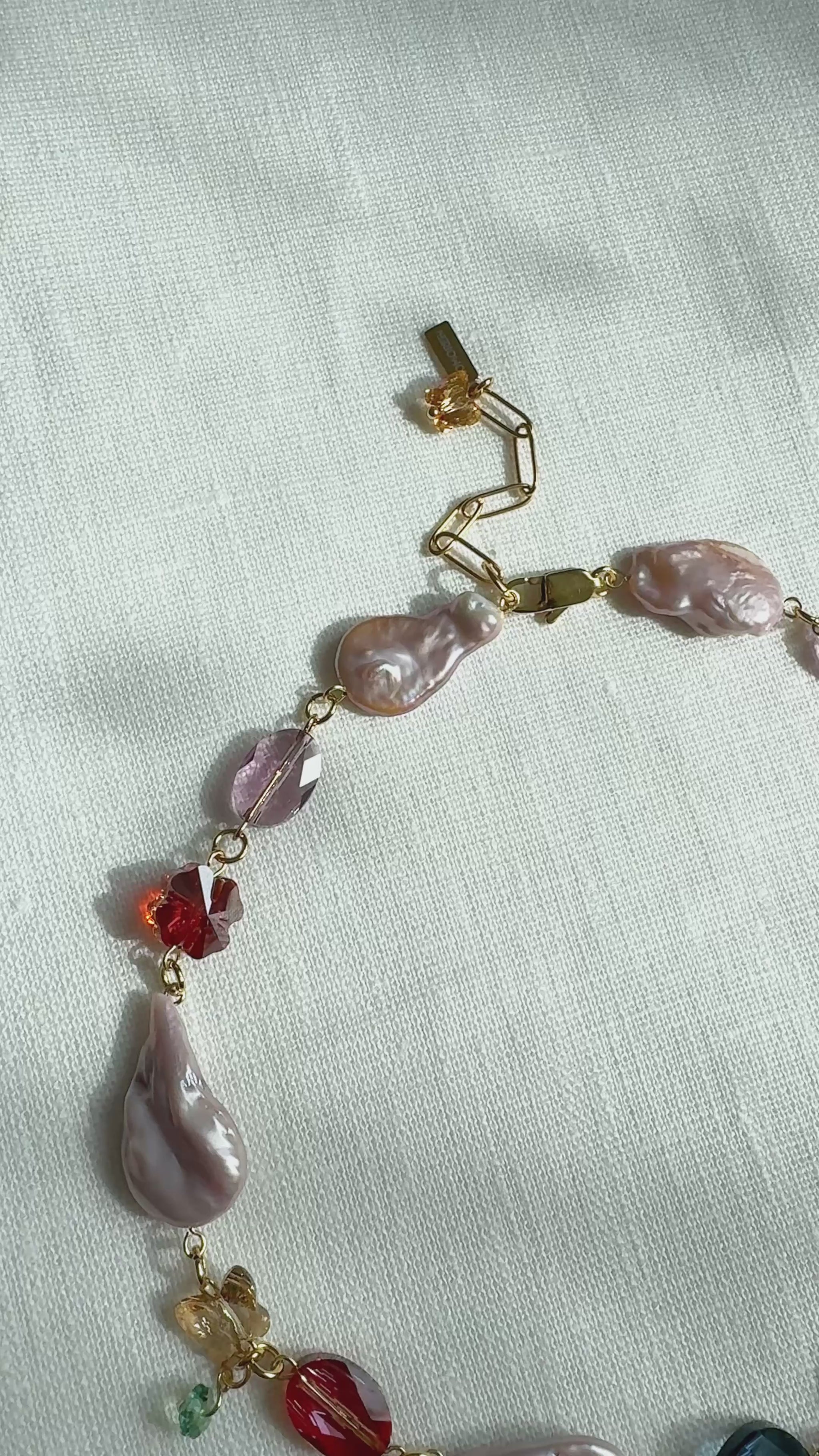 Diese wunderschöne Halskette besteht aus rosafarbenen Barockperlen und hochwertigen, mehrfarbigen Kristallen, wodurch eine einzigartige Mischung aus Texturen und Farben entsteht.