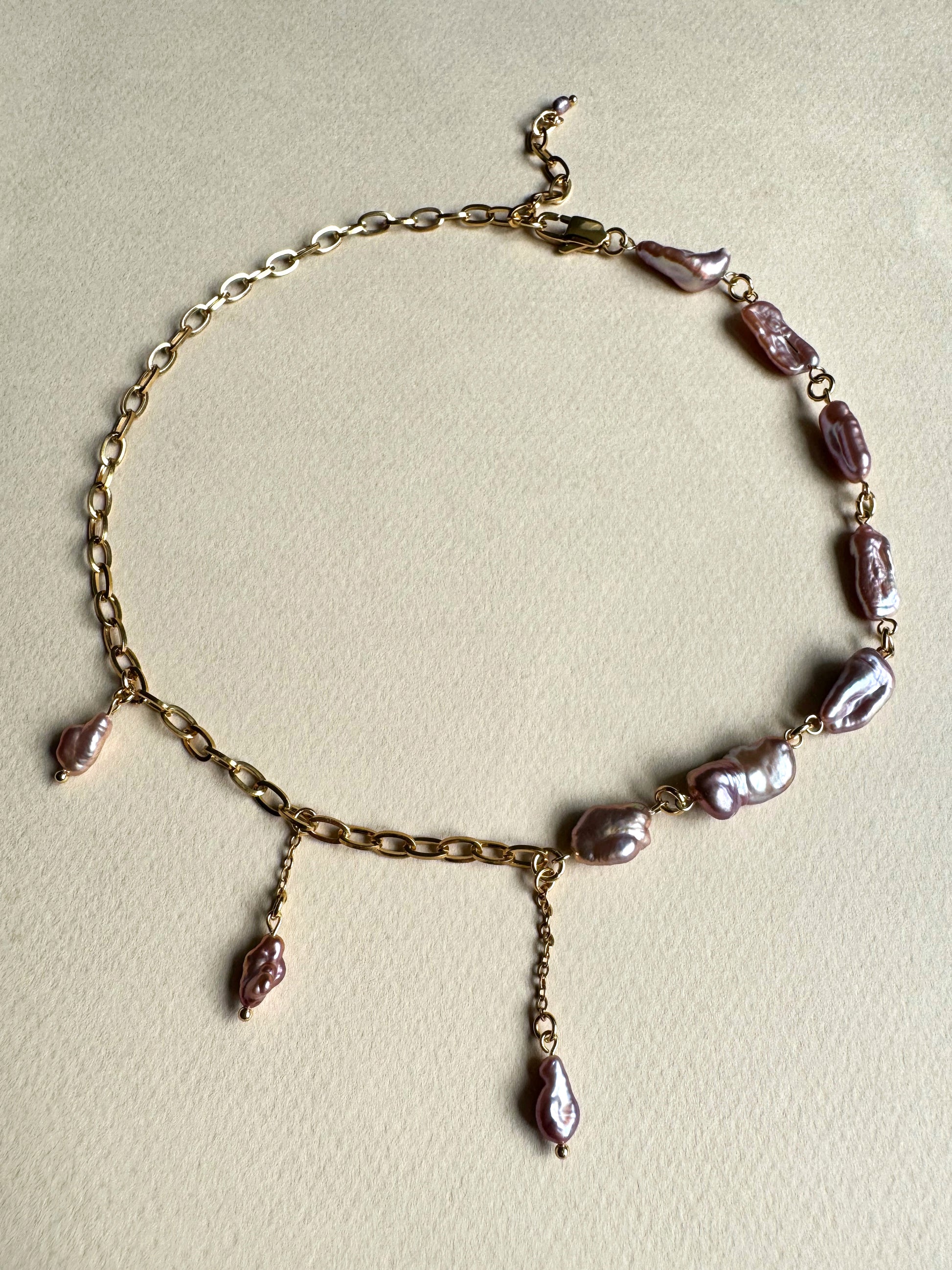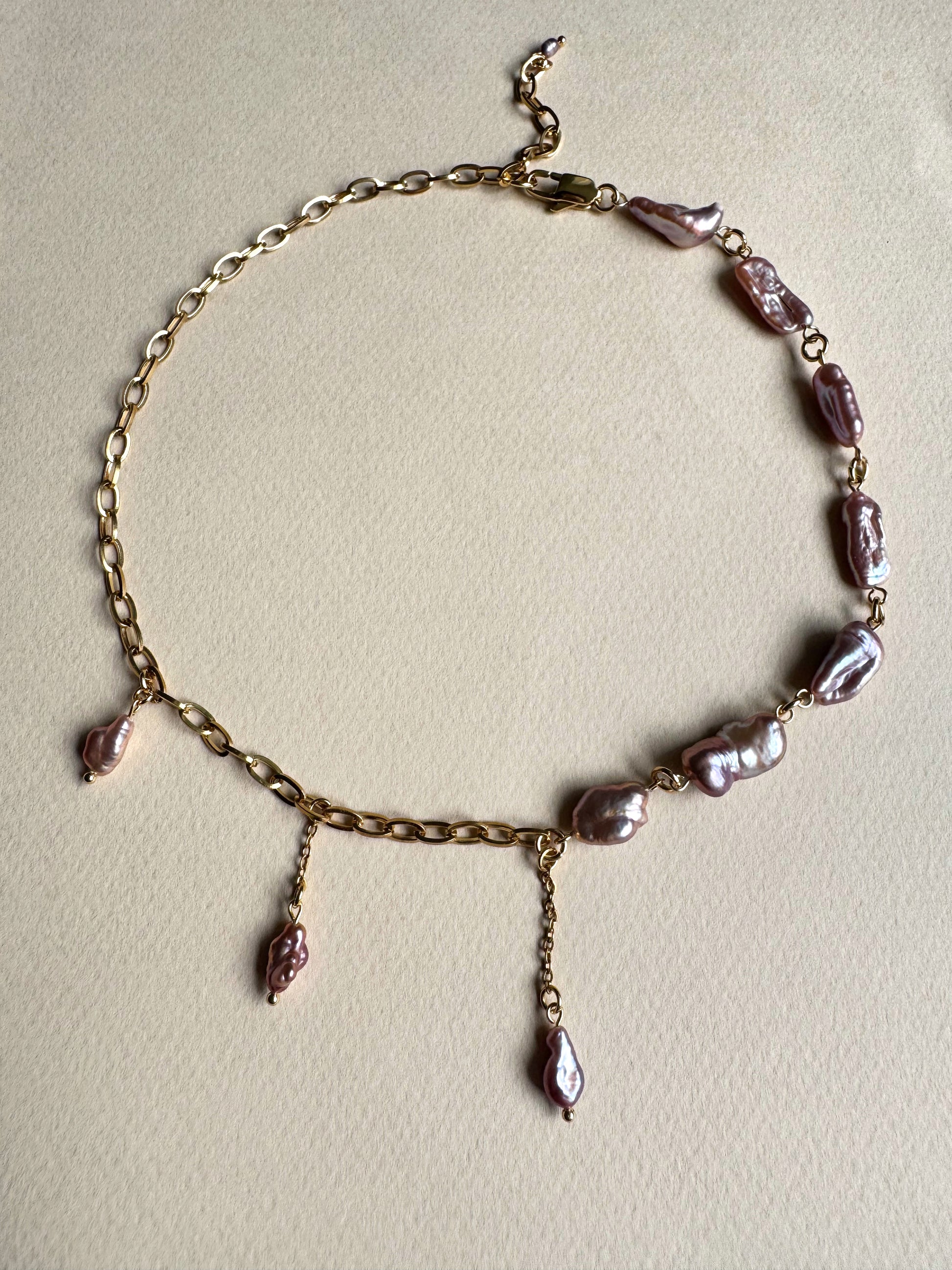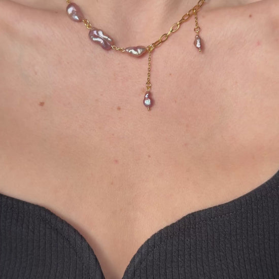 Diese einzigartige Halskette vereint die Eleganz natürlicher, violetter Barockperlen mit der Modernität einer vergoldeten Edelstahlkette.