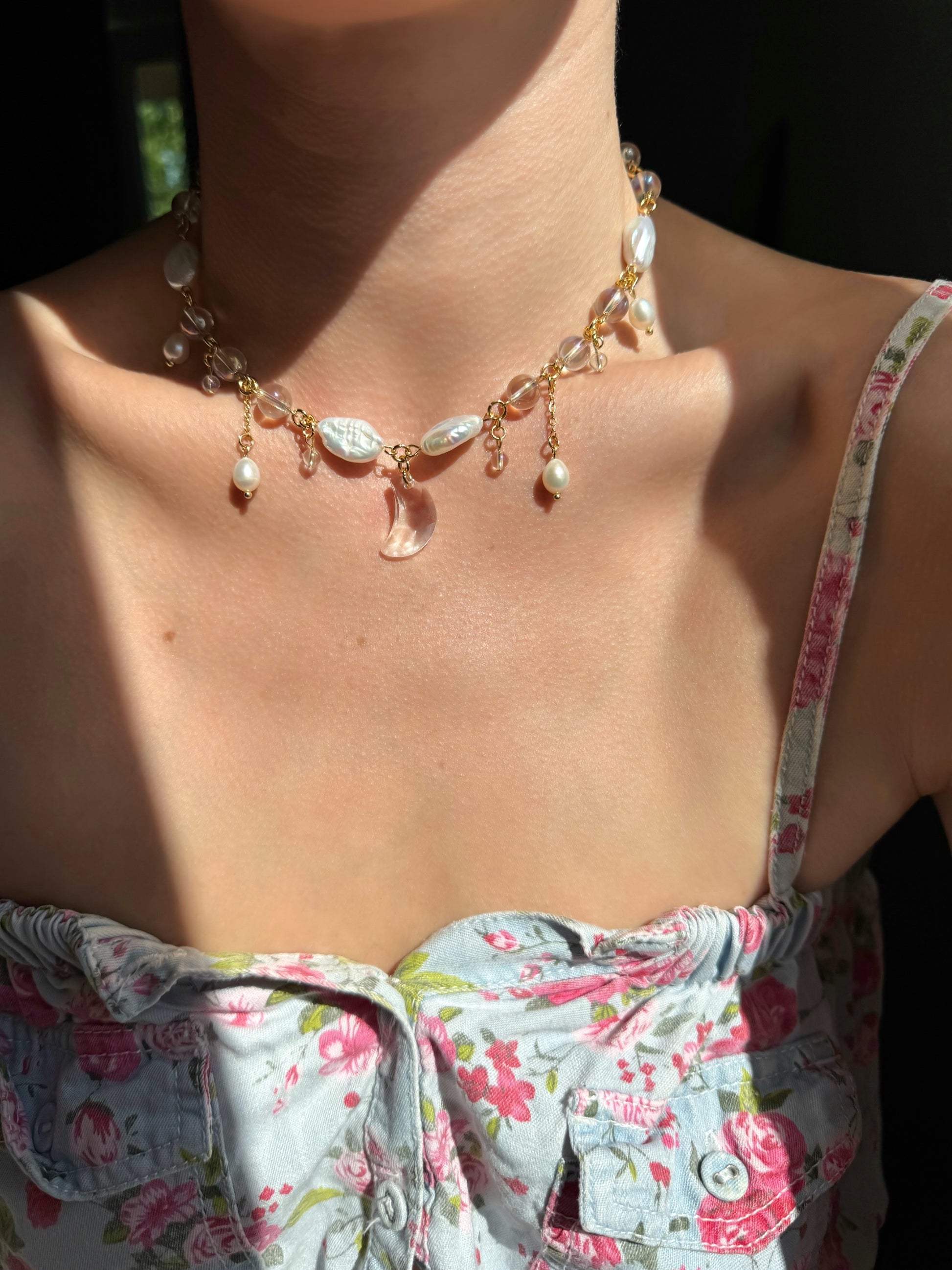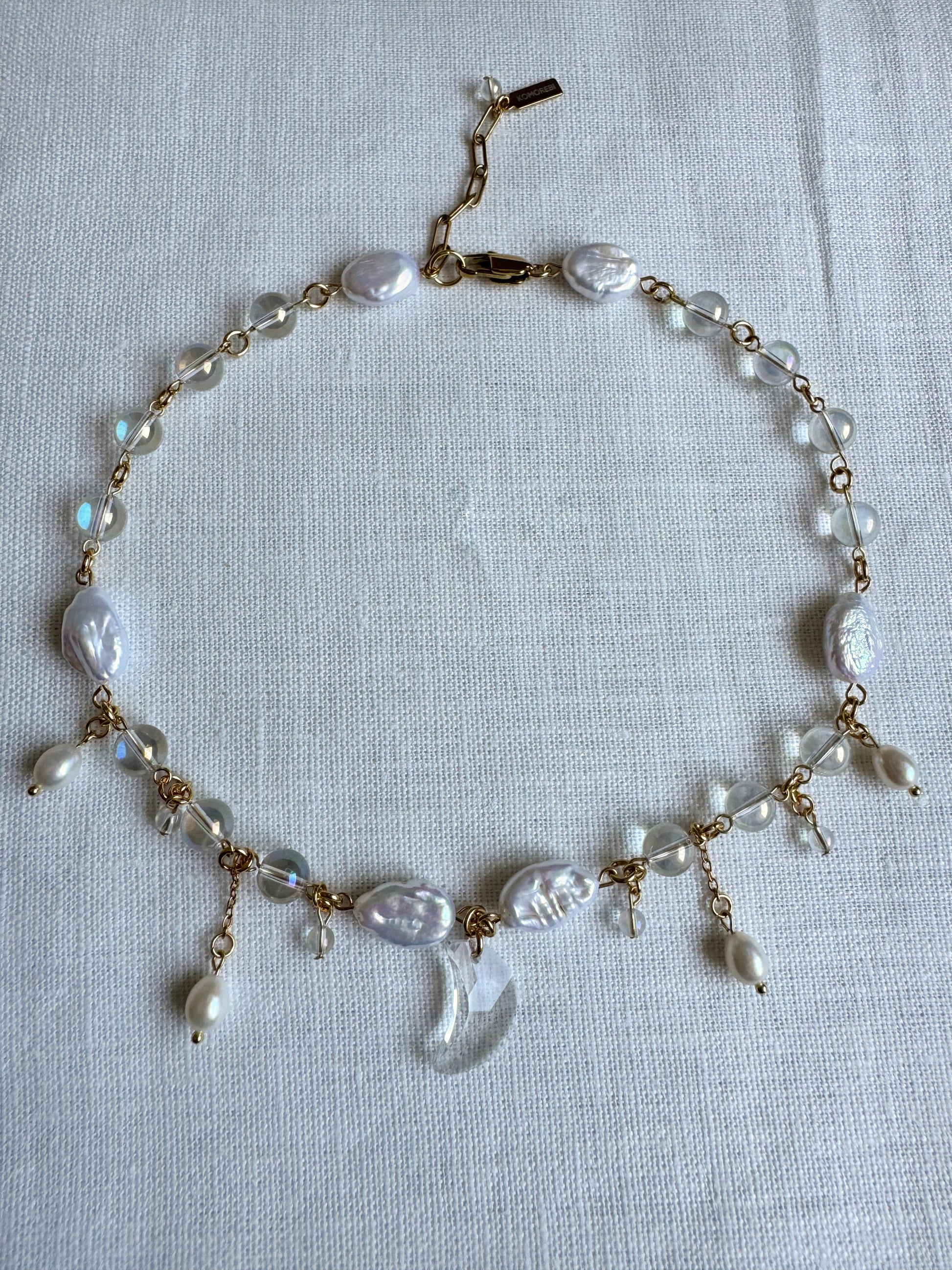 Halskette aus Barockperlen und Angel Aura-Quarzstein mit einem Mondanhänger aus geschliffenem Kristall. Feine Handarbeit.