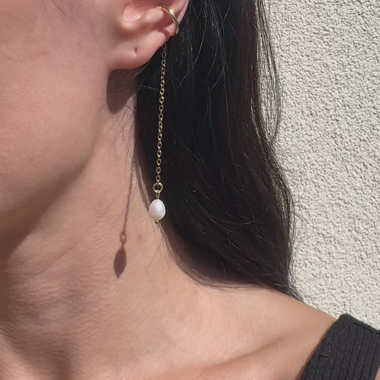 Goldener Ohrring mit Süßwasserperlenanhänger. Ein einzigartiges Schmuckstück, das Ihre Ohren zum Leuchten bringt, ohne sie zu durchstechen.