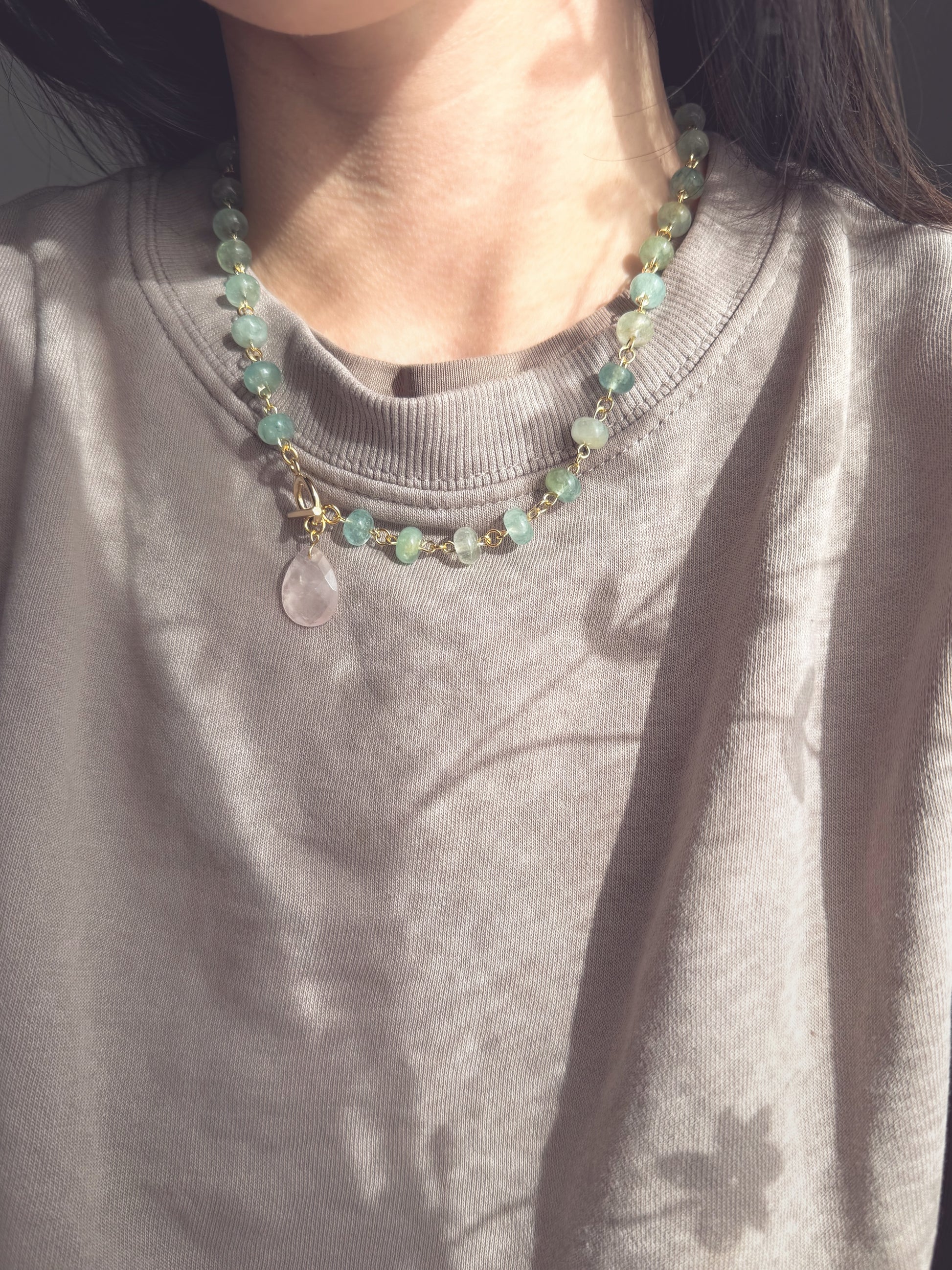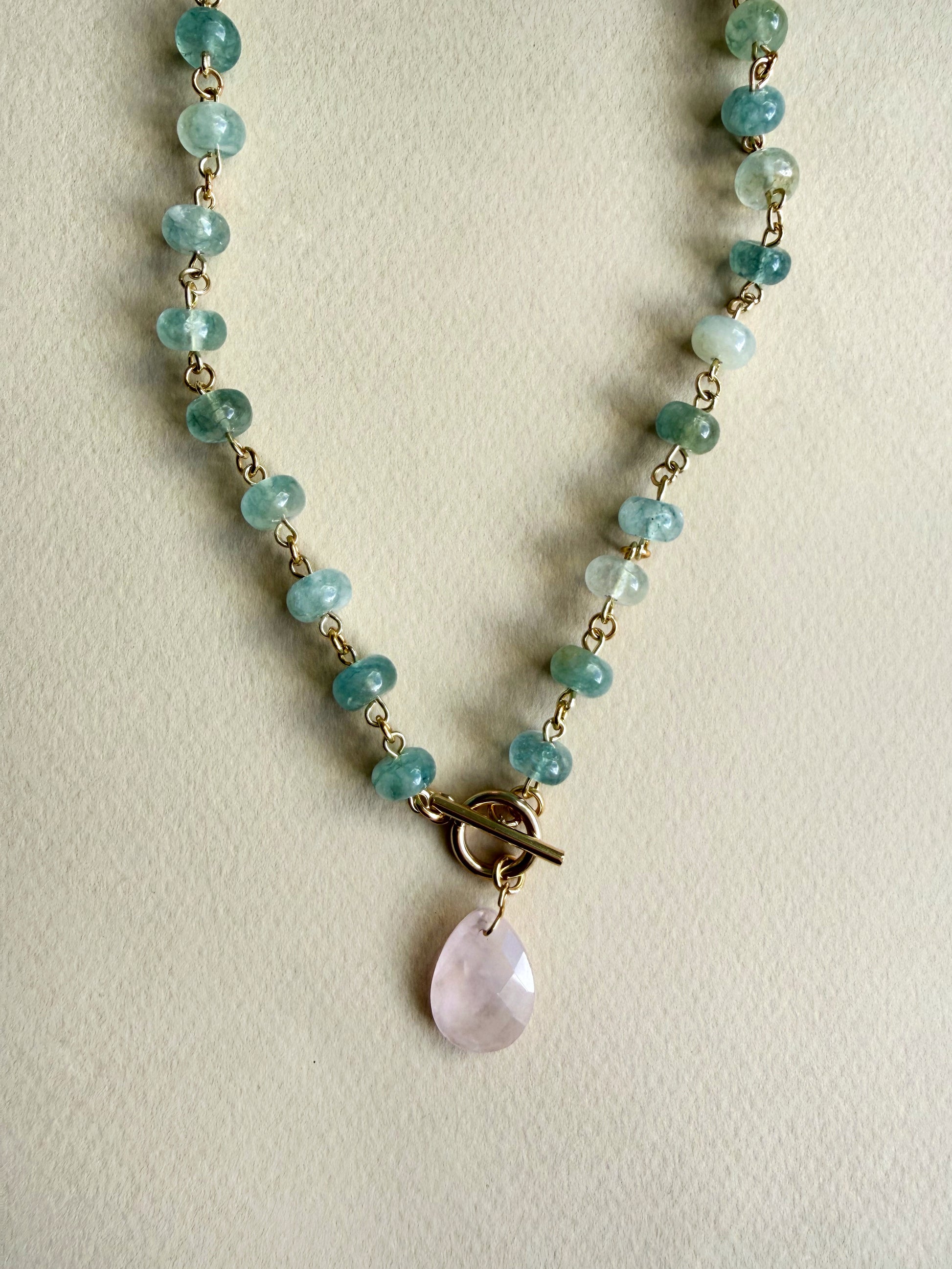 A refreshing necklace composed of natural aqua jade rondelle beads and a faceted rose quartz teardrop pendant.