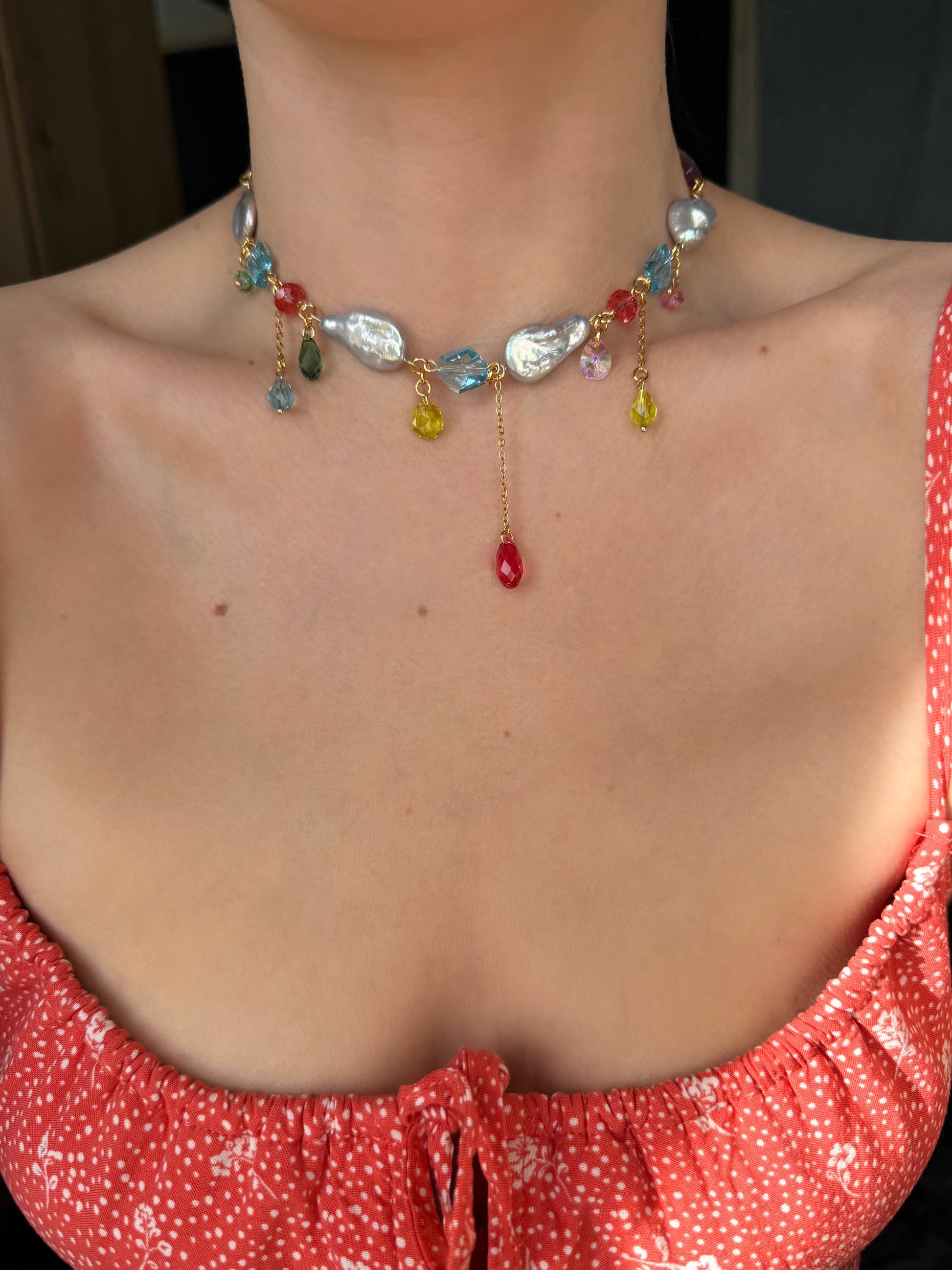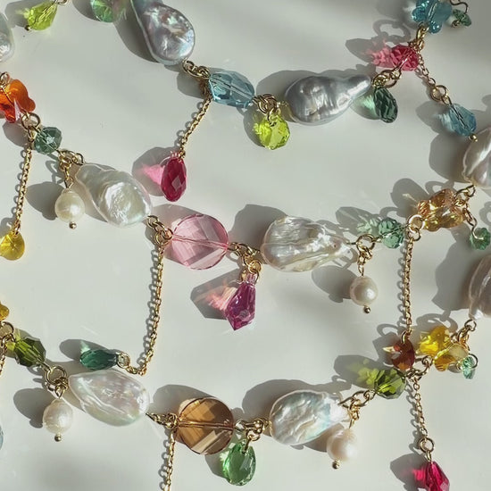 Ce magnifique collier est composé de perles baroques et de cristaux multicolores de haute qualité, créant ainsi un mélange unique de textures et de couleurs.