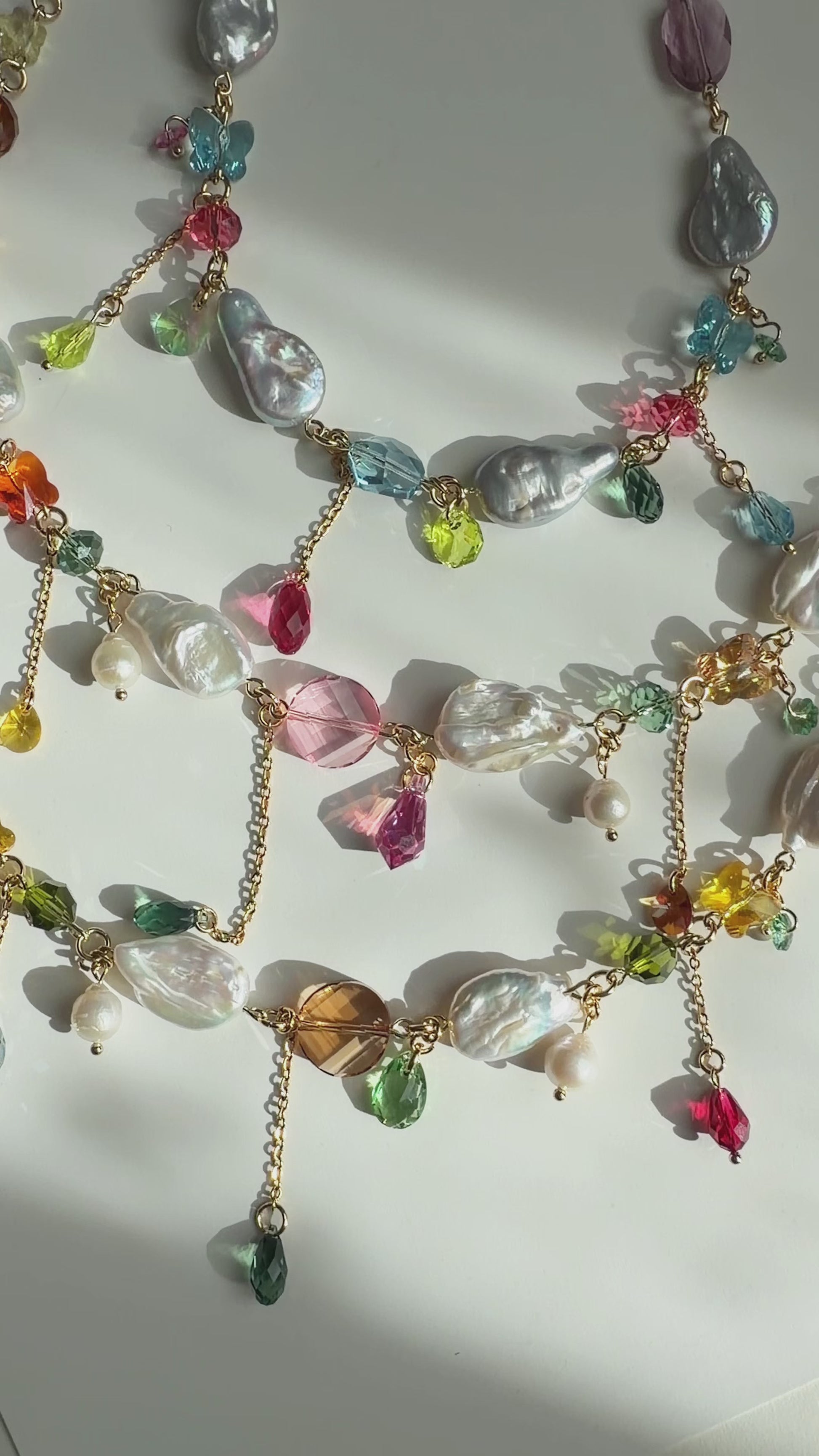 Les perles baroques ajoutent une touche de sophistication intemporelle, tandis que les cristaux multicolores apportent une explosion de couleurs vives et chatoyantes.