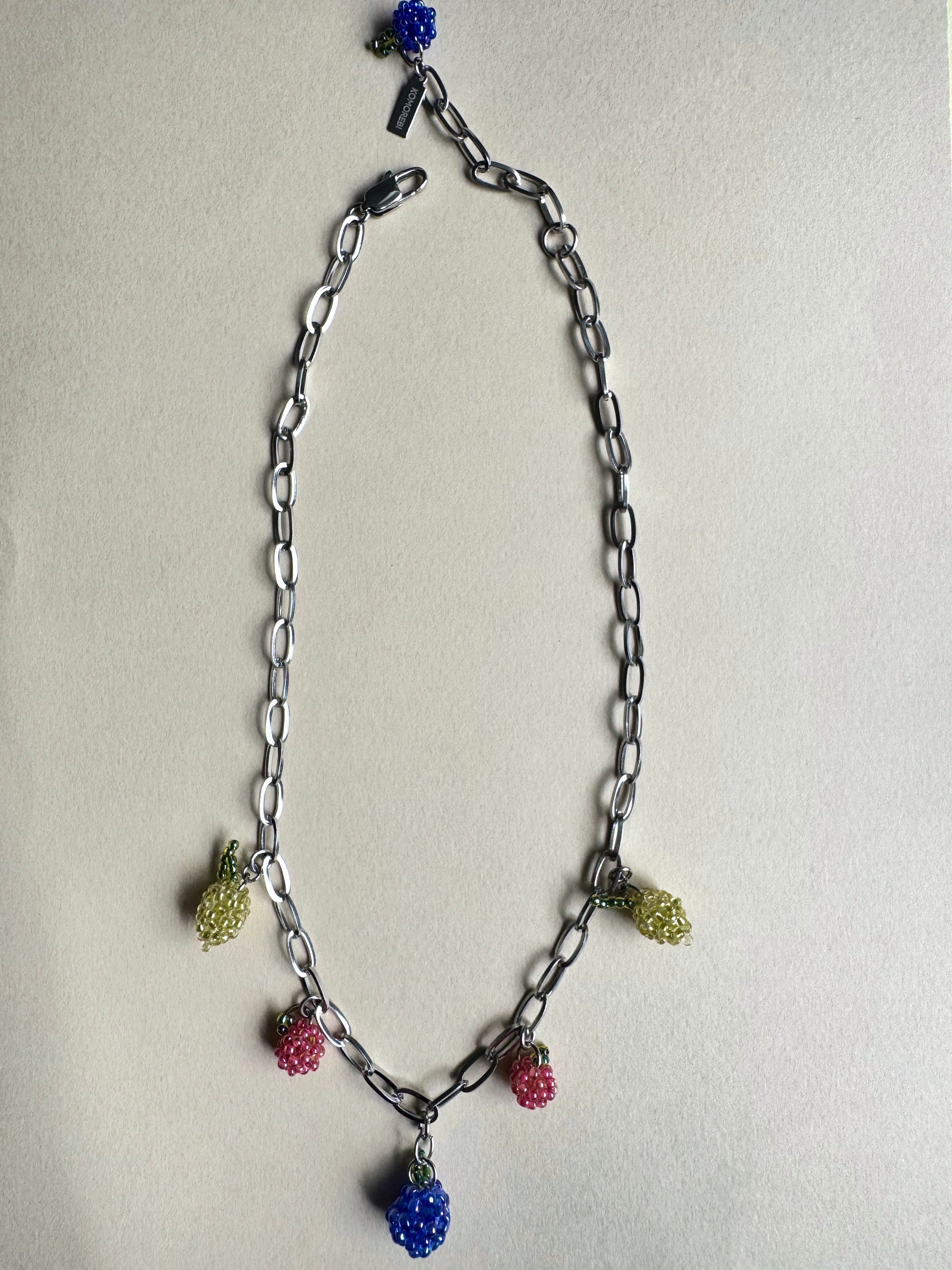 Chaîne trombone argentée en acier inoxydable avec 5 breloques fruits et baies tissée de perles à la main.