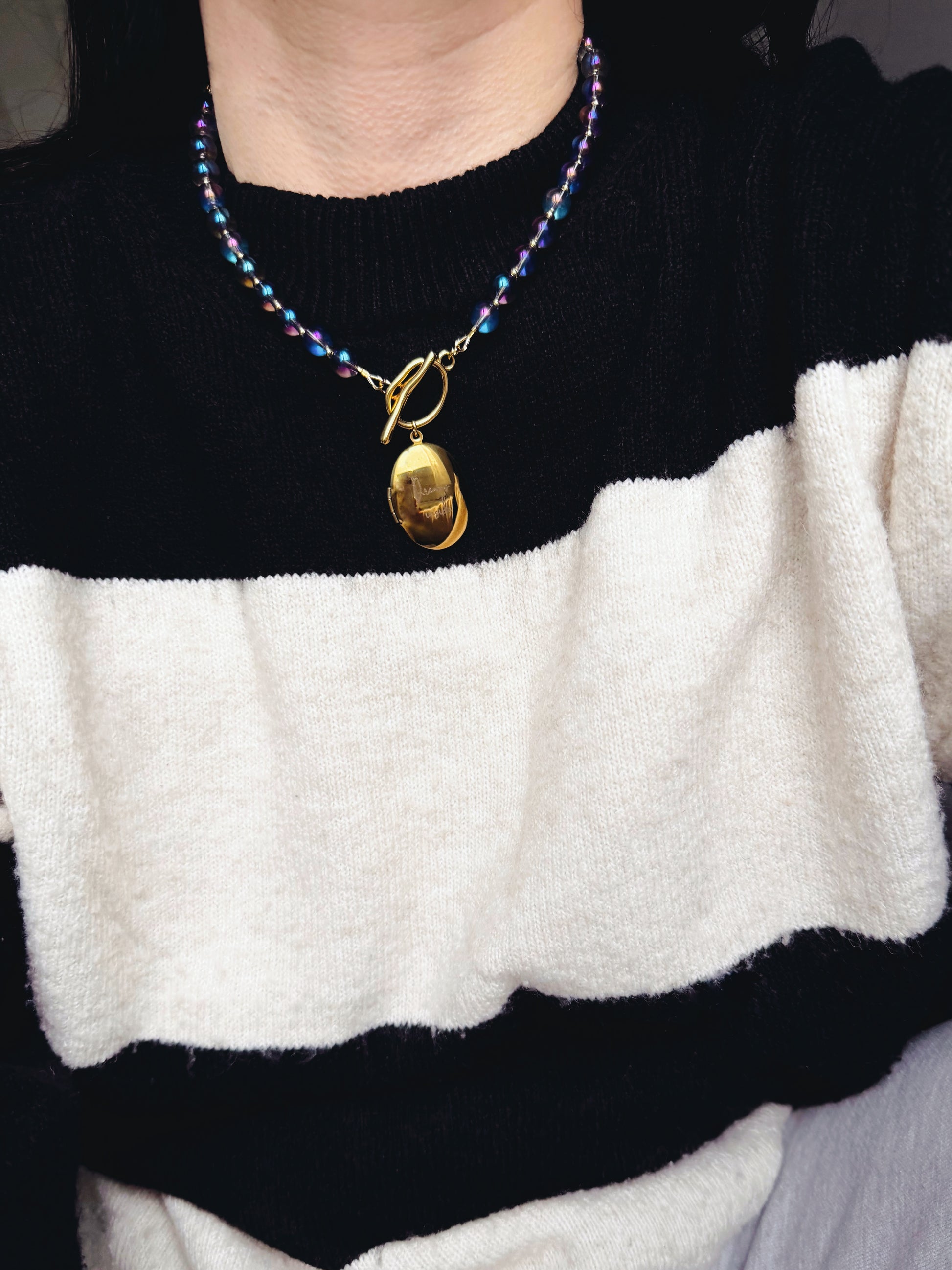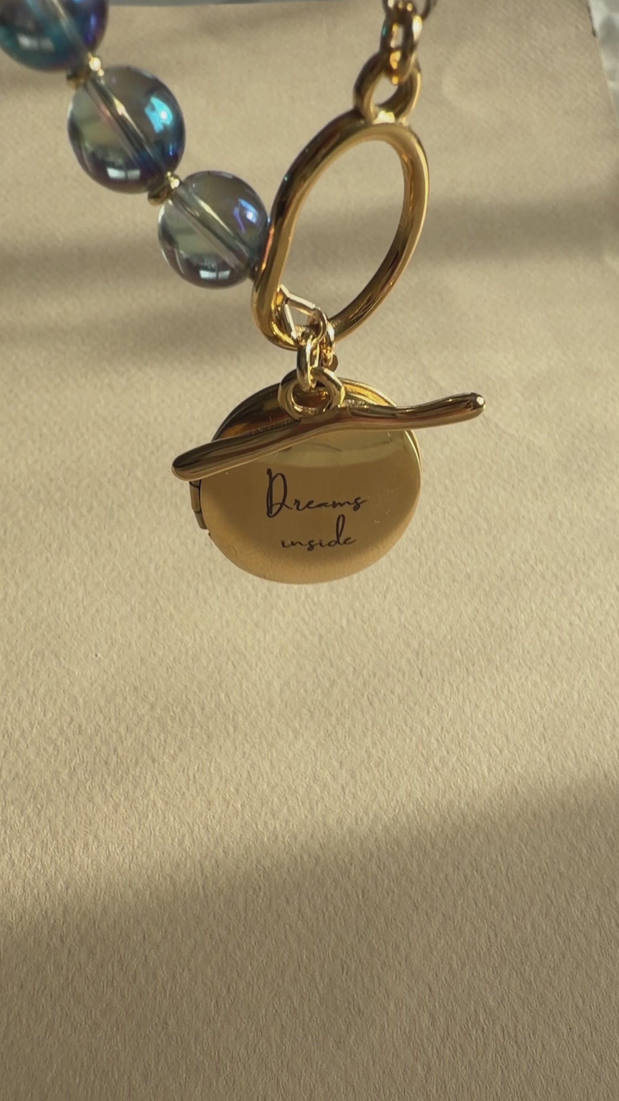 Le collier est accompagné d’un médaillon ouvrant en acier inoxydable gold plated, gravé “dreams inside”. Le médaillon s’ouvre pour accueillir un petit mot, un symbole, une intention ou un secret que vous souhaitez garder près de vous.